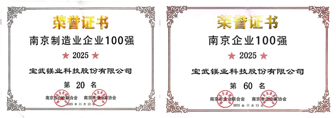 近日,南京市企业联合会与南京市企业家协会共同发布2025年南京市百强企业榜单。宝武镁业(002182)凭借其在轻金属材料领域的持续创新与产业引领能力擒牛宝,成功入选“南京市综合百强企业”第60位,居“南京市制造业百强”第20名,成为本届榜单中轻量化材料领域的亮眼标杆。